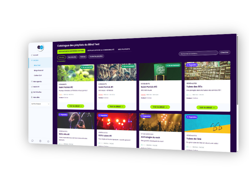 Explorez rapidement la bibliothèque par filtres : nouveautés, thématiques (sport, cinéma, musique, généraliste ...) ou types de jeux.